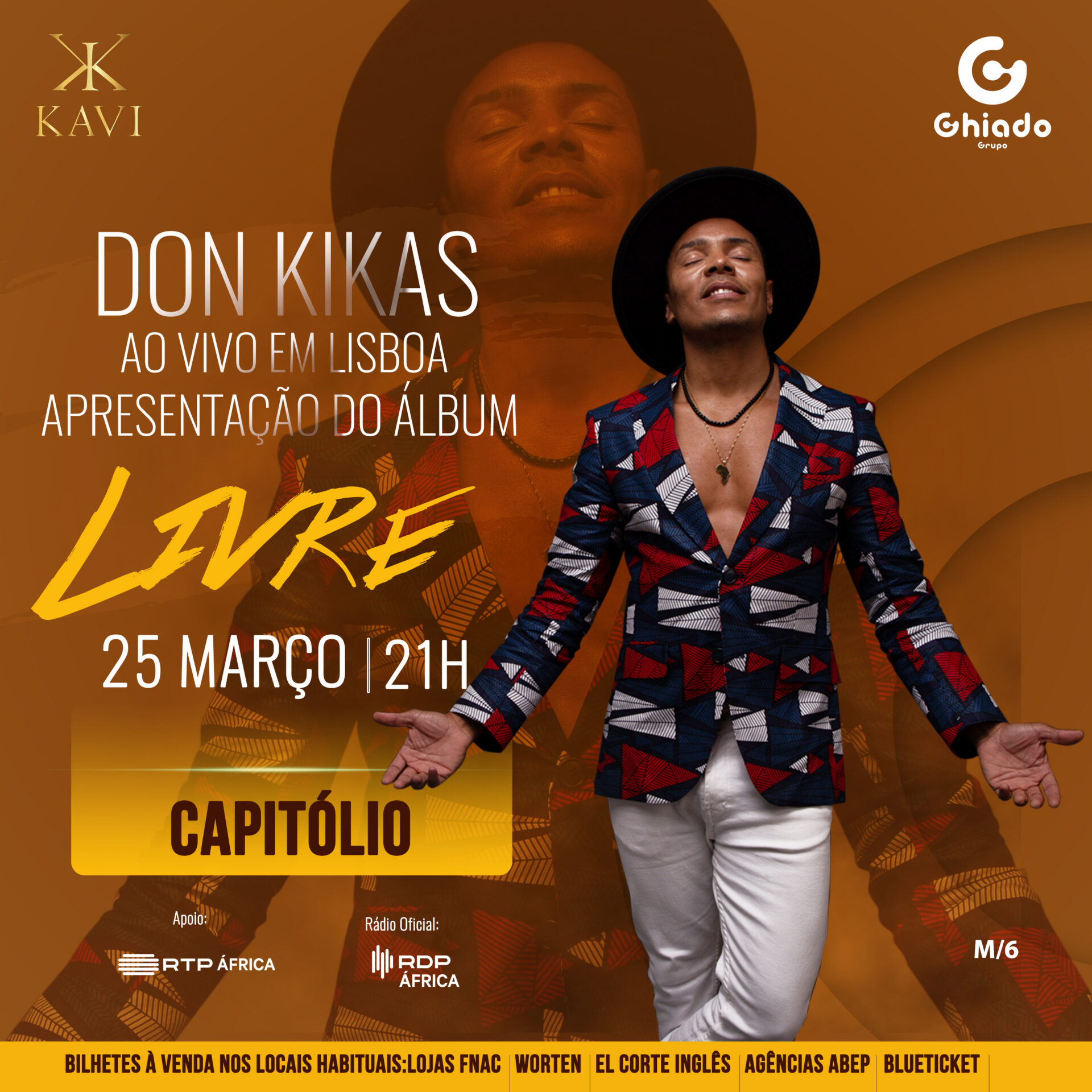 Don Kikas apresenta, a 25 de março, ao vivo, o seu novo álbum “Livre”, num concerto, no Capitólio, que contará com várias surpresas. Grande apreciador e defensor das tradições culturais do seu país de origem, através dos 12 temas do novo trabalho, o sétimo registo de originais, Don Kikas, intérprete e também produtor musical e compositor, quis registar em áudio, o quotidiano de Angola, focando-se sobretudo nos problemas sociais, como forma de alerta e prevenção. Depois dos 25 anos de carreira, “Livre” marca o início de um novo ciclo. Com influência da música jazz, soul e pop, este é um registo um pouco mais autobiográfico onde o cantor assume uma mudança de estética sonora relativamente aos trabalhos anteriores, sem deixar de fora as kizombas e sembas a que já habitou o público. “Vou mostrar um outro lado que sempre existiu mas que nunca foi muito explorado”, desvenda o artista. O single de avanço “Meu Paraíso” – lançado a 14 de fevereiro -, com música e letra da sua própria autoria, já pode ser ouvido nas plataformas digitais e fará também parte do alinhamento deste concerto que será composto, por temas já bastante conhecidos do público, como “Pura Sedução” e “Angolanamente Sensual”, e por temas inéditos.