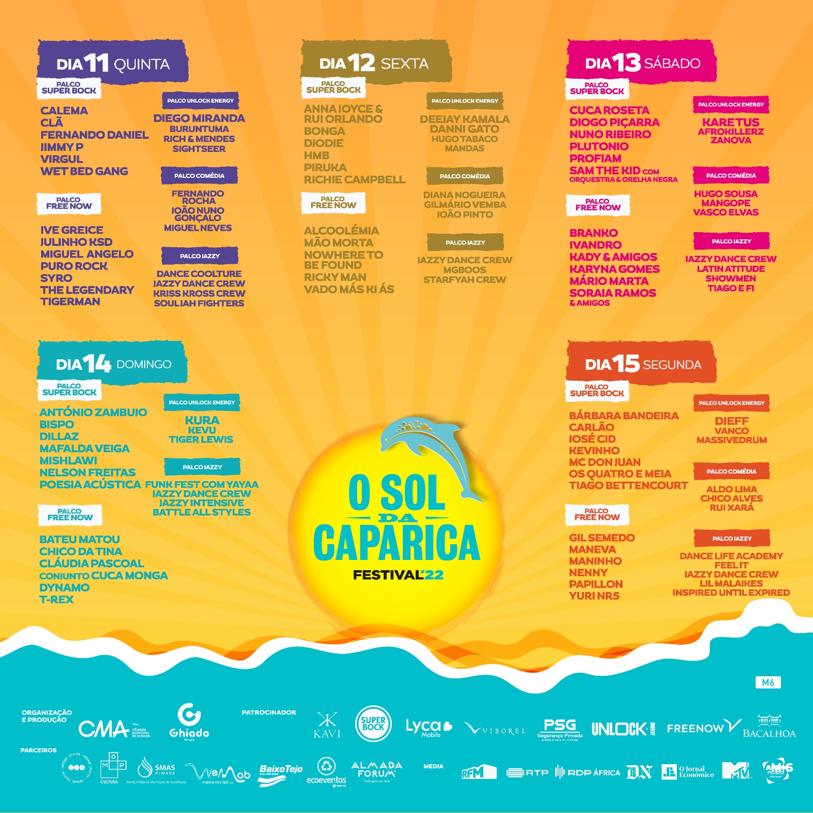 Do pop ao hip hop, do rock à música eletrónica, todos os géneros musicais vão estar presentes nos milhares de m2 do Parque Urbano da Costa da Caparica, que recebe, entre 11 e 15 de agosto, a 7.ª edição d’O Sol da Caparica.  Vão ser cinco dias de muita adrenalina e espírito festivaleiro para público de todas as faixas etárias. Pela primeira vez, a música eletrónica vai estar presente em todos os dias do festival, com um palco próprio pelo qual vão passar vários Djs com os melhores sets nacionais.    E porque o Sol da Caparica, não se faz só de música, para além de várias atrações pelo recinto, o festival contará ainda com um palco dedicado à dança e outro à comédia. Depois de dois anos de interregno, forçado pela pandemia COVID-19, o maior festival de verão dedicado à música de expressão portuguesa regressa à Costa da Caparica, para cinco dias de sol, mar, praia, boa música e muita animação! O Festival Sol da Caparica’22 é uma iniciativa da Câmara Municipal de Almada, com produção do Grupo Chiado.  O Grupo Chiado aconselha a compra de bilhetes apenas em Festicket, Meo Blueticket e nos restantes pontos de venda oficiais: Lojas Fnac, Worten, El Corte Inglês, CTT e Agências Abep. Programação Anunciada até ao momento:11 agostoCalemaClãFernando DanielIve GreiceJimmy PJulinho KSDMiguel AngeloPuro RockSyroThe Legendary TigermanVirgulWetBed GangPalco Eletrónico BuruntumaDiego MirandaRich & MendesSightseer Palco ComédiaFernando RochaJoão Nuno GonçaloMiguel NevesPalco DançaDance CooltureJazzy Dance CrewKing Kross CrewSouljah Fighters 12 agostoAlcoolémia Anna JoyceBonga DjodjeHMBMão MortaNowhere To Be FoundPirukaRichie CampbellRicky ManRui OrlandoVado Más Ki ÁsPalco Eletrónico Deejay Kamala Danni GatoHugo TabacoMandasPalco ComédiaGilmário VembaJoão PintoPalco DançaMGBoosJazzy Dance CrewStar Fyah Crew13 agostoBranko Cuca RosetaDiogo PiçarraIvandroKady e ConvidadasKaryna GomesMário MartaNuno RibeiroPlutónioProfJamSam The Kid com Orquestra e Orelha Negra Soraia Ramos & AmigosPalco EletrónicoAfrokillerzKaretusZanovaZullu & Gabily Palco ComédiaHugo SousaMangopeVasco ElvasPalco DançaJazzy Dance CrewLatin AttitudeShowmenTiago e Fi14 agostoAntónio Zambujo Bateu MatouBispoChico da TinaCláudia PascoalConjunto Cuca MongaDillazDynamoMafalda VeigaMishlawiNelson Freitas Poesia AcústicaT-RexPalco Eletrónico KevuKuraTiger LewisPalco DançaBattle All StylesFunk Fest com Yaya Jazzy Dance CrewJazzy Summer Dance Intensive Dia da CriançaAs Canções da Maria Maravilhoso Mundo do Ambiente Mega Dança Tik-Tok Miss Cindy15 agostoBárbara BandeiraCarlãoJosé Cid KevinhoManeva MC Don JuanNennyOs Quatro e MeiaPapillonTiago BettencourtYuri NR5 Palco EletrónicoDjeffMassivedrumVanco Palco Comédia Aldo LimaChico AlvesRui Xará Palco DançaInspired Until ExpiredFeel it Jazzy Dance Crew Jazzy Dance Kids Crew Lil MalaikesLil Malaikes kids