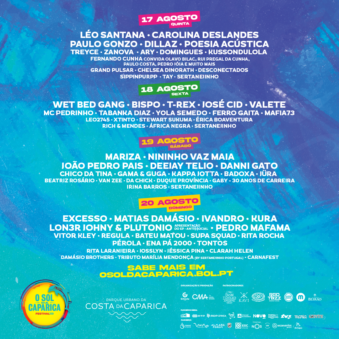 O Sol da Caparica volta ao Parque Urbano da Costa da Caparica de 17 a 20 de agosto para a sua 8.ª edição. Quatro dias de sol, praia, boa música e muita animação para público de todas as faixas etárias. Uma edição que se apresenta renovada, preparada para proporcionar ao público a melhor experiência no maior festival dedicado à música de expressão portuguesa. Do pop ao hip hop, do rock à música africana, todos os géneros musicais vão ecoar durante os dias de festival, através dos muitos artistas da Lusofonia que passarão pelos 5 palcos existentes este ano, no recinto. Produzido pelo Grupo Chiado, em parceria com a Câmara Municipal de Almada, O Sol da Caparica é um festival muito acarinhado pelo público num dos locais mais icónicos do município de Almada que se diferencia pela sua diversidade musical e cultural. Cartaz