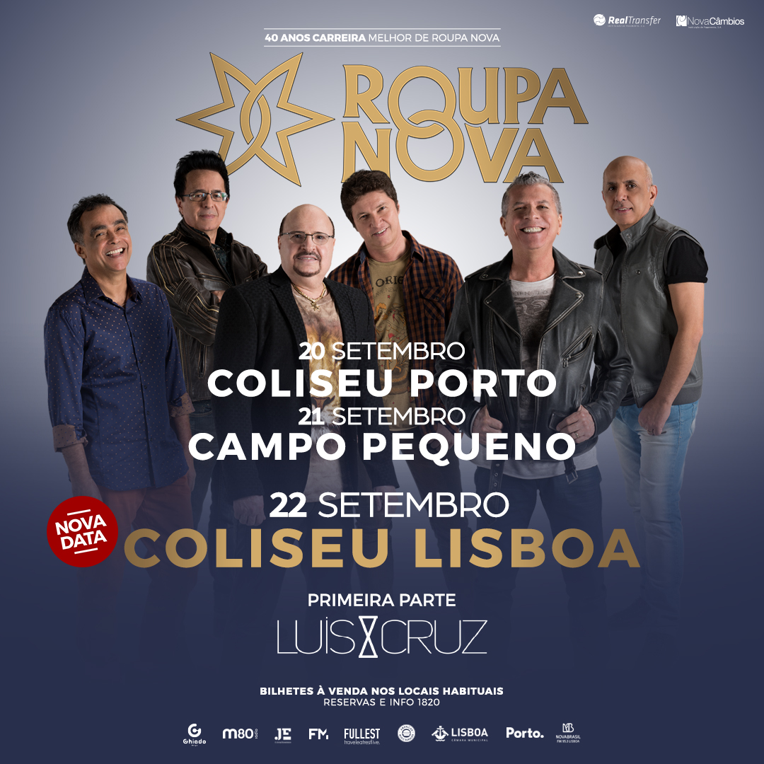 Depois de esgotar o espetáculo de comemoração dos 40 anos de carreira, no Campo Pequeno, em Lisboa, a banda brasileira ROUPA NOVA anuncia um concerto extra no dia seguinte, 22 de setembro, no palco do Coliseu dos Recreios. Assim, no espaço de apenas uma semana, a celebração de quatro décadas de carreira da banda conhecida pelos êxitos Dona e Linda Demais faz-se com três grandes concertos em três das mais emblemáticas salas do país: Coliseu Porto, Campo Pequeno e Coliseu dos Recreios. Em palco, para além da apresentação do novo trabalho Todo Amor do Mundo, os ROUPA NOVA trazem à lembrança de todos, hits como Trem Azul, “Coração Pirata”, “Começo, Meio e Fim” ou ainda “Whisky a Go Go”, entre muitos outros. A primeira parte das celebrações estão ao cargo de Luís Cruz, o jovem promissor músico, compositor, escritor, intérprete e produtor.Um espetáculo a não perder!
